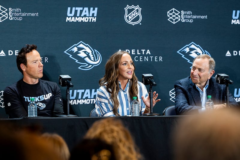 Ashley Smith speaks while joined by her husband, Ryan, both co-owners of the Utah Mammoth and Smith Entertainment Group, and NHL commissioner Gary Bettman during a press conference announcing the Utah Hockey Club is changing their name to Utah Mammoth held at the Delta Center in Salt Lake City on Wednesday, May 7, 2025. | Photo courtesy of Isaac Hale 1. Make the new state-of-the-art practice facility in Sandy a hub of fan interaction.