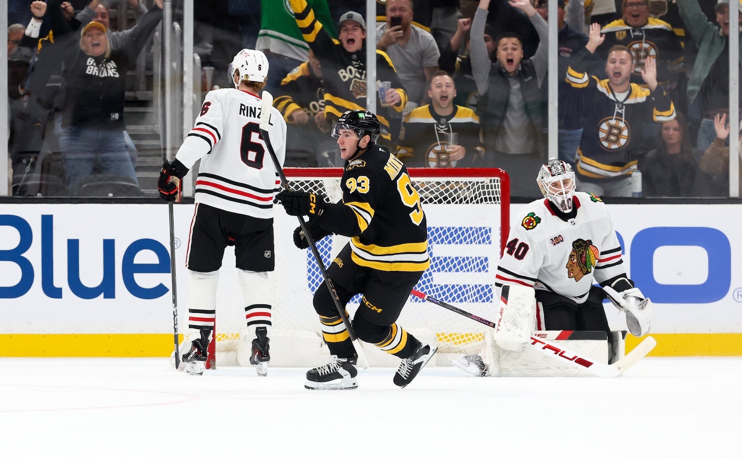 BOSTON, MASSACHUSETTS – OCTOBER 9: Fraser Minten #93 of the Boston Bruins celebrates his overtime goal against Arvid Soderblom #40 of the Chicago Blackhawks. (Rich Gagnon/Getty Images)