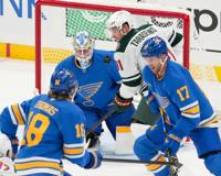 St. Louis Blues goaltender Jordan Binnington (50) eyes the puck during the season opening game against the Minnesota Wild on Oct. 9 at Enterprise Center. (Source: West Newsmagazine/Lou Countryman photo)