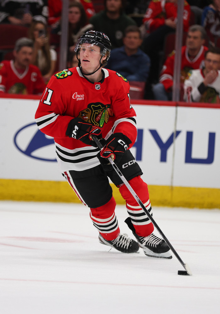 CHICAGO, IL – APRIL 02: Oliver Moore #11 of the Chicago Blackhawks controls the puck during overtime against the Colorado Avalanche on April 2, 2025 at the United Center in Chicago, Illinois. (Photo by Melissa Tamez/Icon Sportswire)