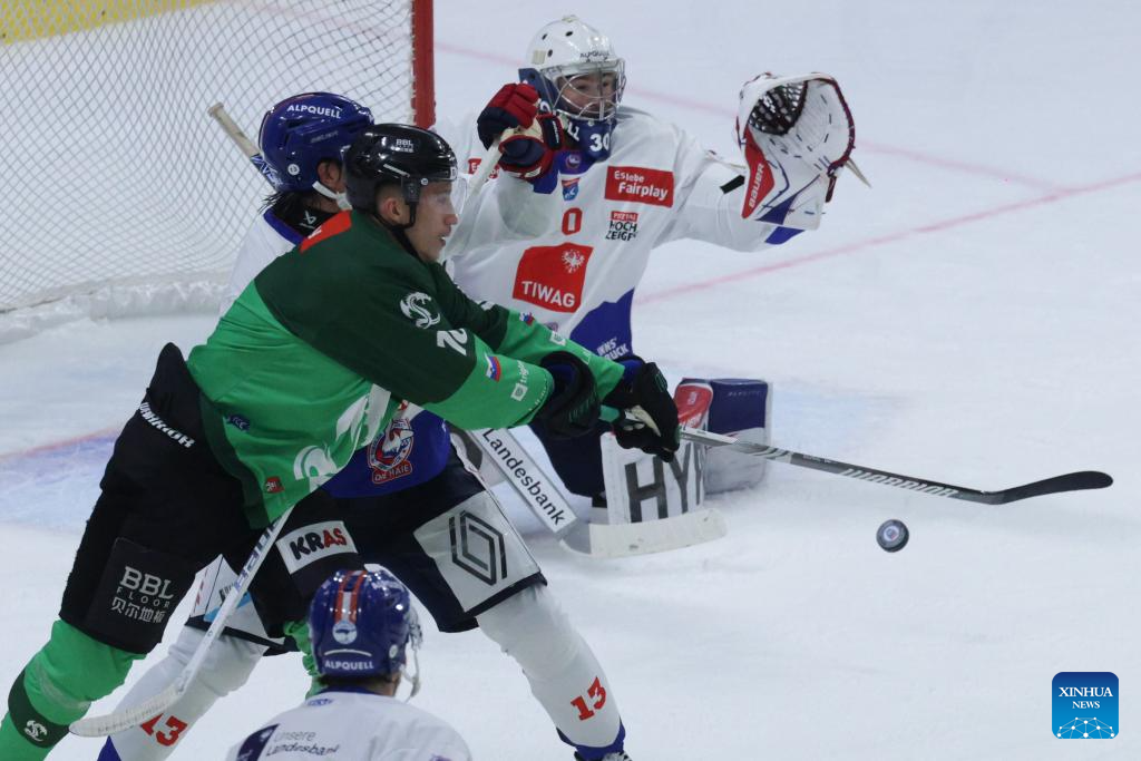 Sebastian Benker (L) of HC TIWAG Innsbruck shoots during the 2025/26 Win2day Ice Hockey League match between HK Olimpija and HC TIWAG Innsbruck in Ljubljana, Slovenia, Oct. 12, 2025. (Photo by Zeljko Stevanic/Xinhua)
