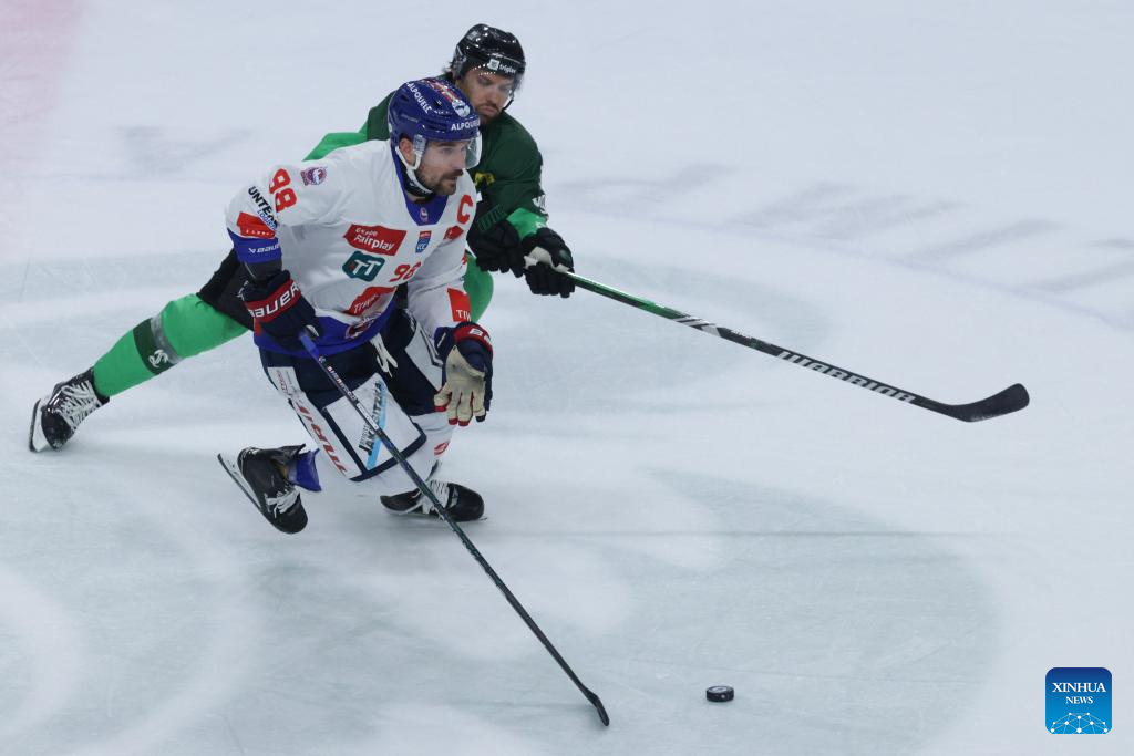 Jan Lattner (front) of HC TIWAG Innsbruck vies with Zach Boychuk of HK Olimpija during the 2025/26 Win2day Ice Hockey League match between HK Olimpija and HC TIWAG Innsbruck in Ljubljana, Slovenia, Oct. 12, 2025. (Photo by Zeljko Stevanic/Xinhua)