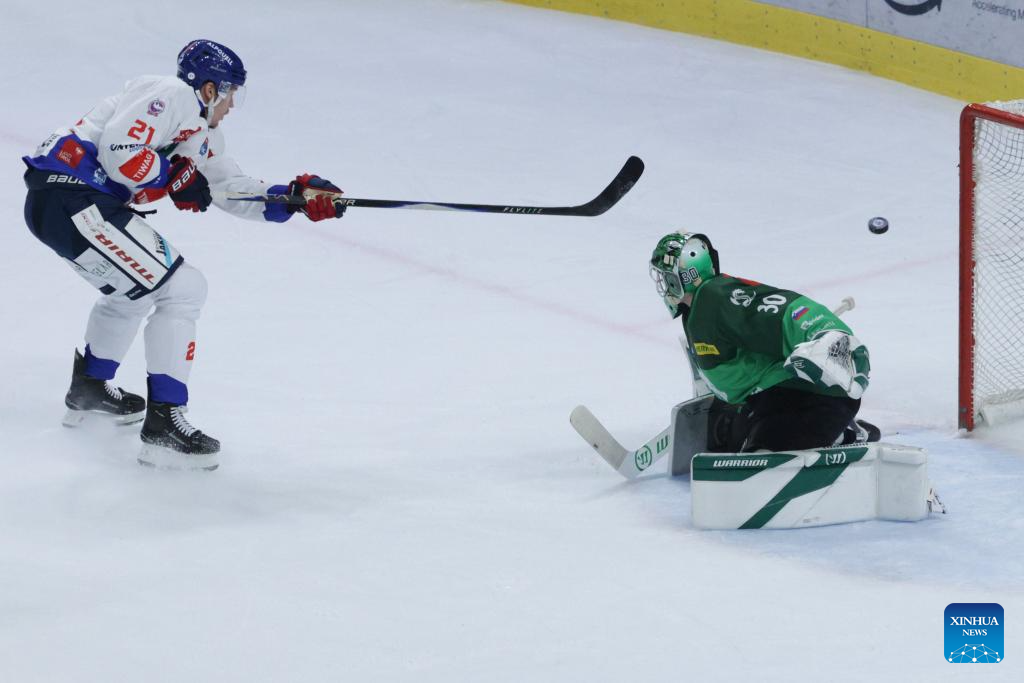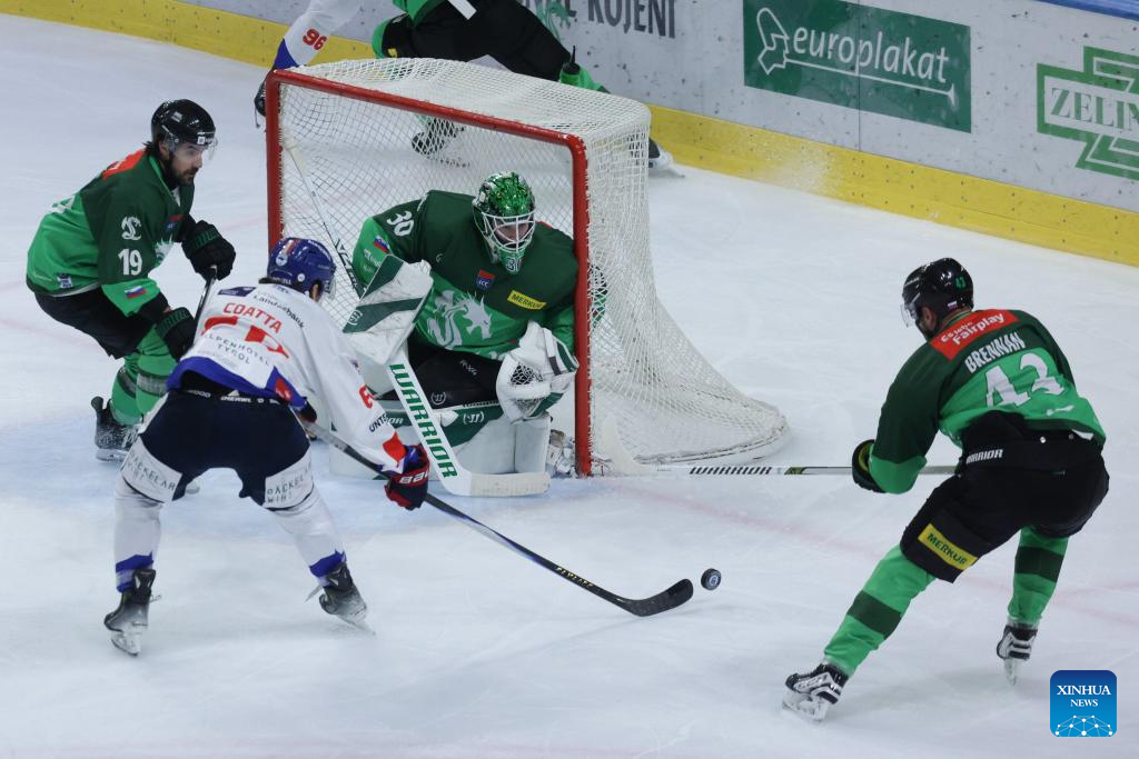 Marcel Mahkovec (C) of HK Olimpija shoots during the 2025/26 Win2day Ice Hockey League match between HK Olimpija and HC TIWAG Innsbruck in Ljubljana, Slovenia, Oct. 12, 2025. (Photo by Zeljko Stevanic/Xinhua)
