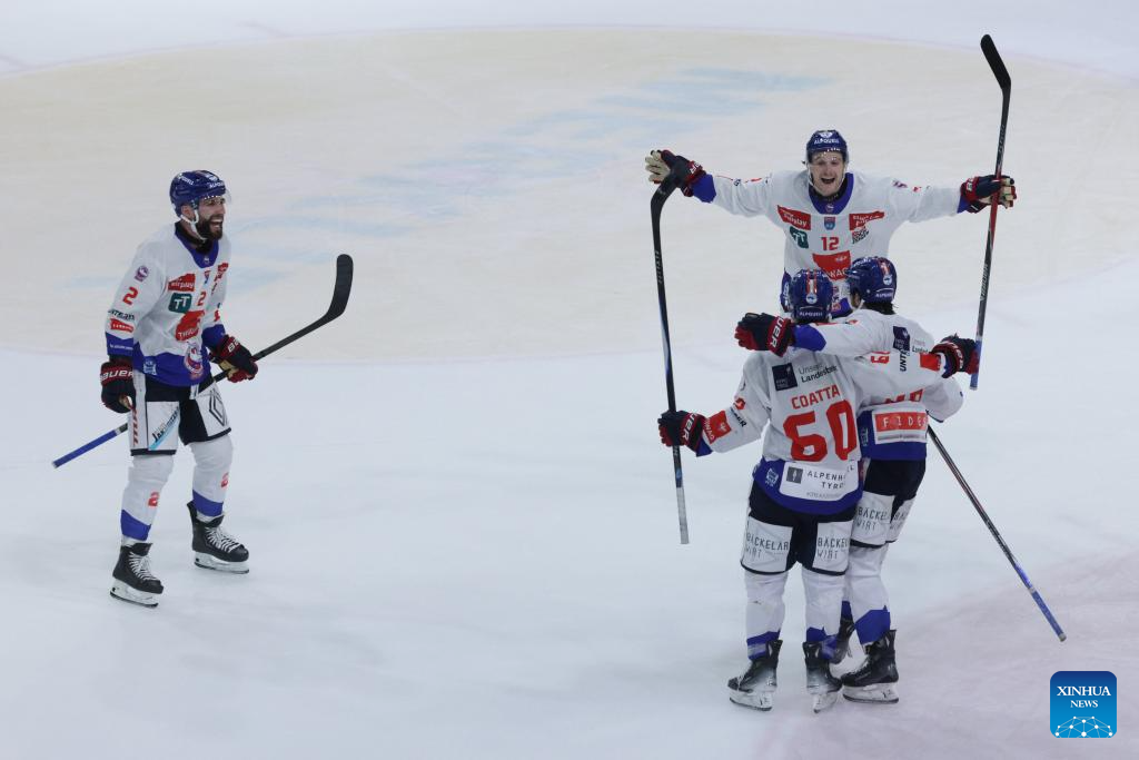 Players of HC TIWAG Innsbruck celebrate victory after the 2025/26 Win2day Ice Hockey League match between HK Olimpija and HC TIWAG Innsbruck in Ljubljana, Slovenia, Oct. 12, 2025. (Photo by Zeljko Stevanic/Xinhua)
