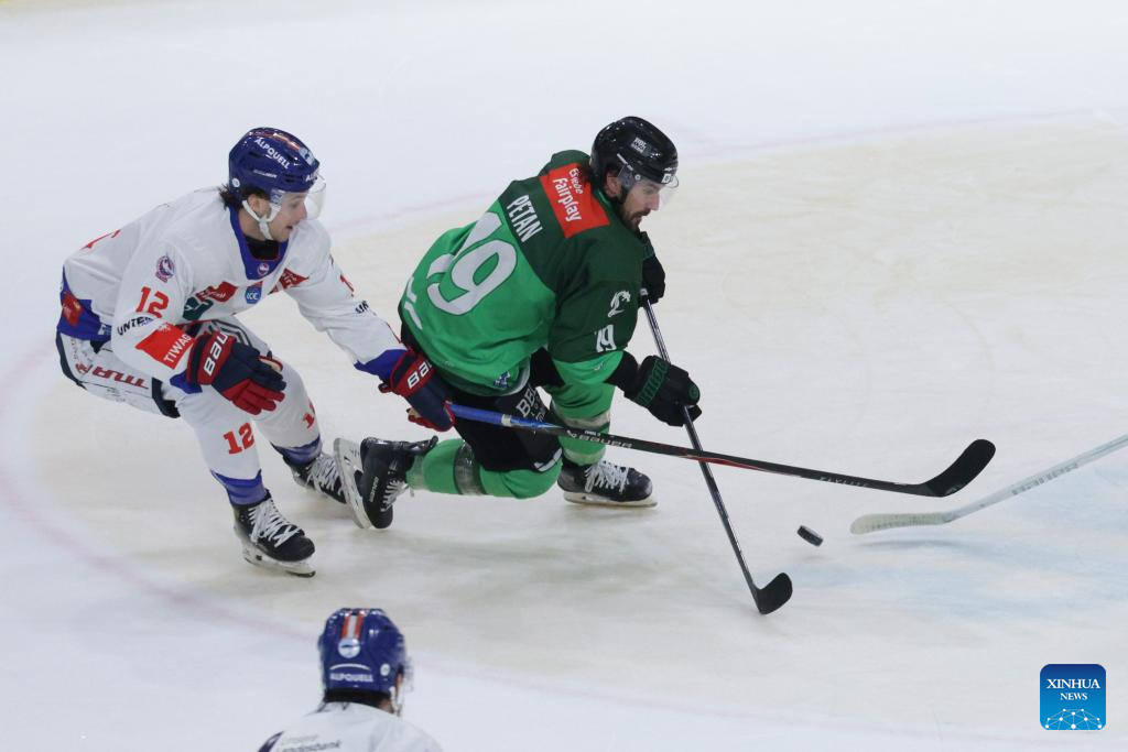 Alex Petan (R) of HK Olimpija vies for the puck during the 2025/26 Win2day Ice Hockey League match between HK Olimpija and HC TIWAG Innsbruck in Ljubljana, Slovenia, Oct. 12, 2025. (Photo by Zeljko Stevanic/Xinhua)