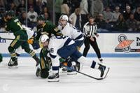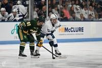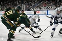 Forward Aiden Fink (18)Â watches the face off during the Penn State mens hockey home opening game against Clarkson on Thursday, Oct. 9, 2025 in Pegula Ice Arena in University Park, Pa. The Golden Knights beat the Nittany Lions 6-4.