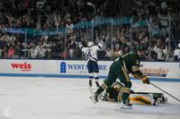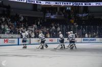 Defense Jarod Crespo (24) raises arms at the end of the Penn State mens hockey homecoming game against Clarkson on Friday, Oct. 10, 2025 in Pegula Ice Arena in University Park, Pa. The Nittany Lions beat The Golden Knights 5-2.