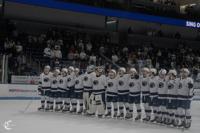 Penn State Men’s Hockey team sings the alma mater at the end of the Penn State mens hockey homecoming game against Clarkson on Friday, Oct. 10, 2025 in Pegula Ice Arena in University Park, Pa. The Nittany Lions beat The Golden Knights 5-2.
