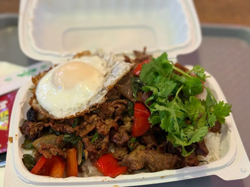 I did have an unbelievable dinner at a food hall yesterday afternoon (I ate at 4 p.m. and then passed out from travel exhaustion by 7 p.m.). It was the spiciest Basil Beef I’ve ever had, and I couldn’t get enough. It takes a lot of spice to get me to sweat, but they succeeded.