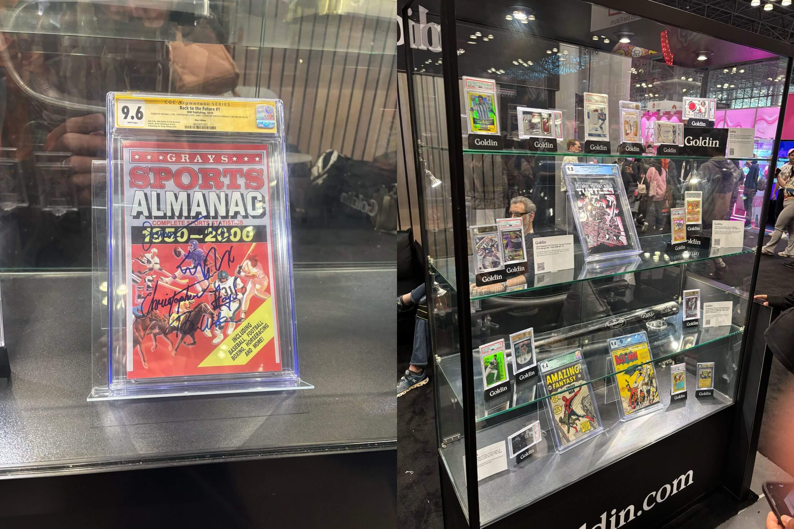 The Goldin Auctions booth featured a variety of sports cards and memorabilia, plus a cast-autographed copy of the Grays Sports Almanac from “Back to the Future II”