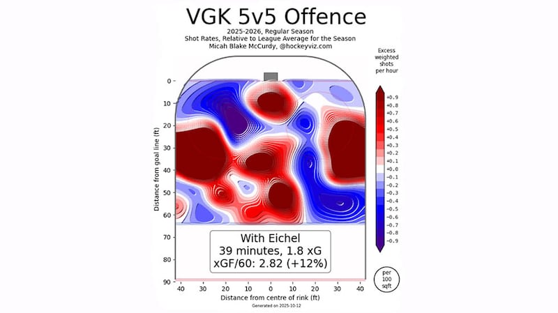 Much like the Pinto example above, Vegas’ minutes with Eichel on the ice are a steady flood of dangerous scoring chances (via HockeyViz):