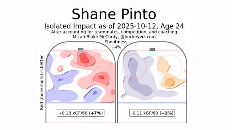 Pinto is spending his early minutes of the season with fellow youngster Ridly Greig and the veteran Claude Giroux, and so far that trio has been a beautiful marriage. Pinto’s minutes see a steady flurry of scoring opportunities from the net mouth and between the circles, indicative of a player and a unit creating dangerous offensive sequences on a regular basis (isolated impacts via HockeyViz):