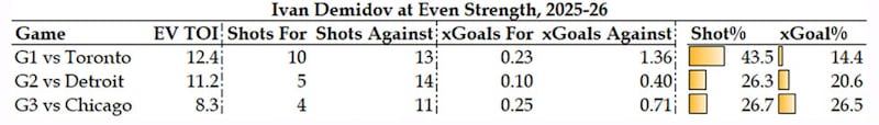 On the negative side of the ledger, Demidov’s minutes at even strength have been a challenge. Playing primarily with Alex Newhook and Oliver Kapanen, Montreal has been heavily outshot, spending significant time in the defensive zone: