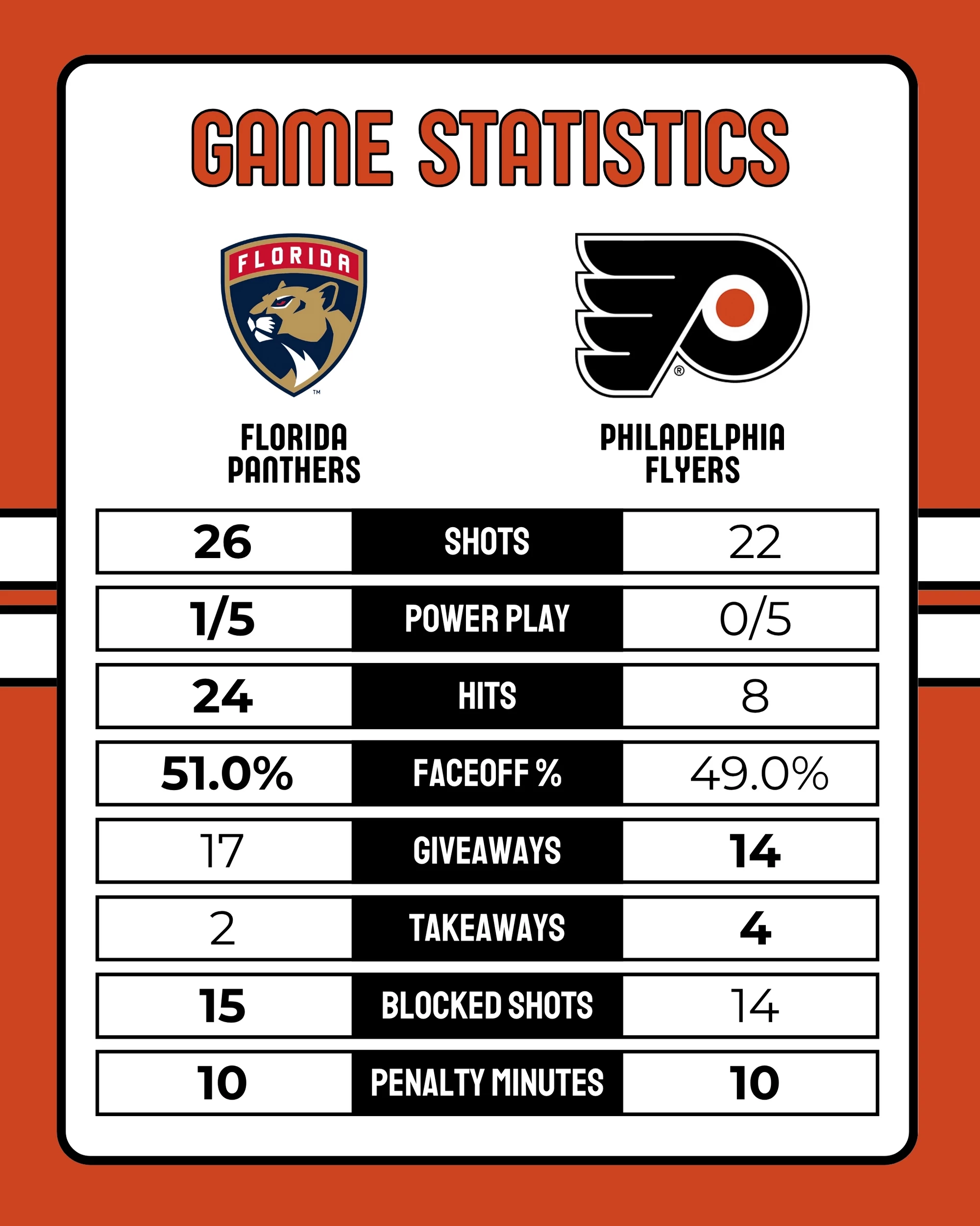 Flyers-Panthers Game Statistics 10-13-2025