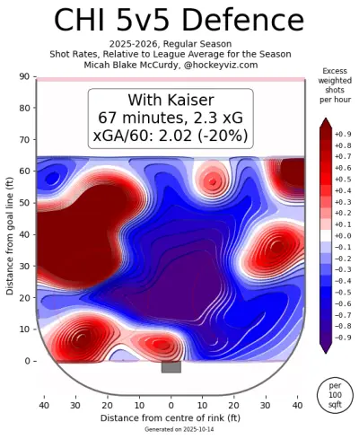 Wyatt Kaiser has had an impressive start to the season. He’s not incredible, but he’s the best Blackhawks defenseman right now. Kaiser has the best Corsi relative to teammates for defensemen through four games (+18.83/60). A large part of that is how Jeff Blashill wants his defensemen to be more aggressive in the neutral zone. Kaiser has been effective at standing up the blueline and defending the red line by creating turnovers and making it difficult for the opposition to make entries. With Kaiser, the Hawks have a 2.2 expected goals against rate—without him, they have a 3.66 xGA/60.