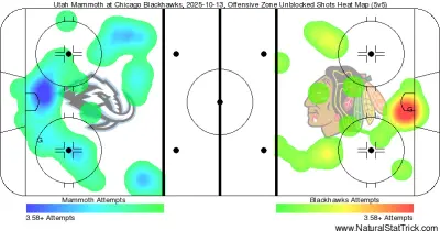 Jeff Blashill’s system includes his defensemen being aggressive and making it difficult for the opposition to enter their zone. The Utah Mammoth had a difficult time entering the Hawks’ zone and establishing possession, which is why a good portion of the game was spent going back and forth in the neutral zone. Last season, Utah led the league in 5-on-5 shots off the rush per 60 (15.03). By forcing Utah to dump the puck, this slowed their offense down. This is what Utah opted to do during the second and third periods.