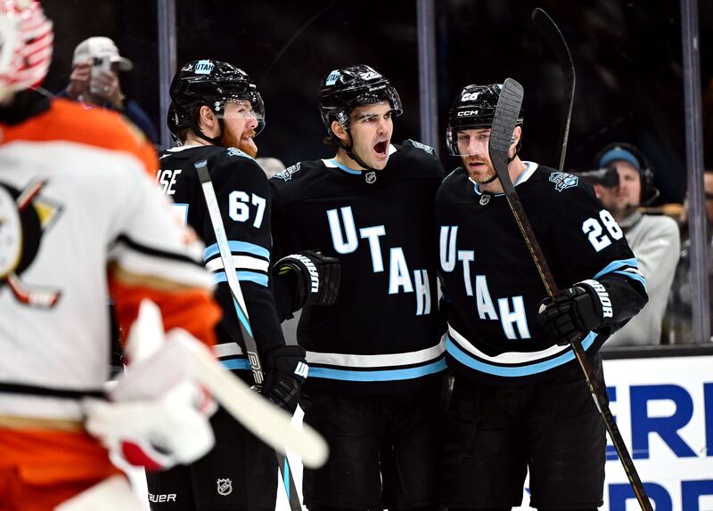 Utah Hockey Club center Jack McBain (22) celebrates with teammates after scoring a goal as they play at the Delta Center in Salt Lake City on Wednesday March 12, 2025. | Scott G Winterton, Deseret News