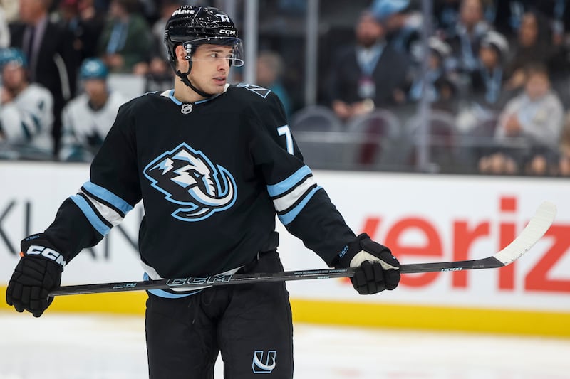 Utah Mammoth right wing JJ Peterka (77) looks on during the third period of a preseason NHL game against the San Jose Sharks at the Delta Center in Salt Lake City on Saturday, Oct. 4, 2025. | Rio Giancarlo, Deseret News
