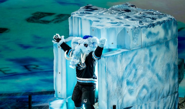 Tusky, a 6-foot-5 blue mammoth with a mohawk, burst onto the scene ahead of the Mammoth’s home opener on Wednesday, emerging from a giant block of ice with “00″ across the back of his Utah Mammoth home jersey.