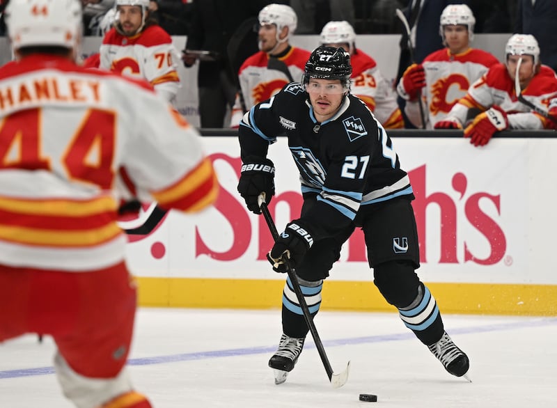 Utah Mammoth center Barrett Hayton (27) passes the puck as the Utah Mammoth and Calgary Flames play at the Delta Center in Salt Lake City on Wednesday, Oct. 15, 2025. | Scott G Winterton, Deseret News
