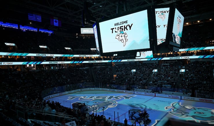 The Utah Mammoth’s new mascot Tusky is presented to the fans prior to the game against the Calgary Flames at the Delta Center in Salt Lake City on Wednesday, Oct. 15, 2025. | Scott G Winterton, Deseret News