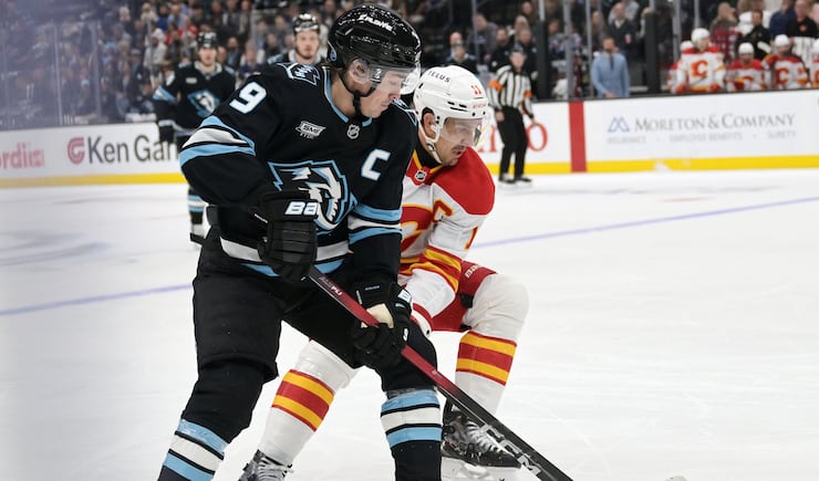 Utah Mammoth right wing Clayton Keller (9) passes the puck past Calgary Flames center Mikael Backlund (11) as the Utah Mammoth and Calgary Flames play at the Delta Center in Salt Lake City on Wednesday, Oct. 15, 2025. | Scott G Winterton, Deseret News