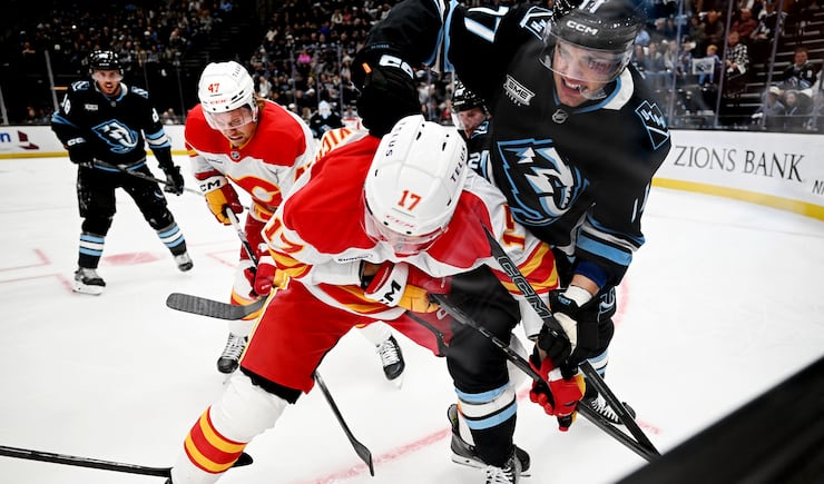 Calgary Flames center Yegor Sharangovich (17) and Utah Mammoth right wing JJ Peterka (77) battle for the puck as the Utah Mammoth and Calgary Flames play at the Delta Center in Salt Lake City on Wednesday, Oct. 15, 2025. | Scott G Winterton, Deseret News