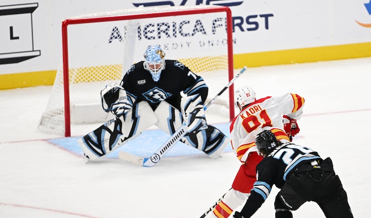 Utah Mammoth goaltender Karel Vejmelka (70) tends the goal as Calgary Flames center Nazem Kadri (91) readies for a shot in the third period as the Utah Mammoth and Calgary Flames play at the Delta Center in Salt Lake City on Wednesday, Oct. 15, 2025. | Scott G Winterton, Deseret News