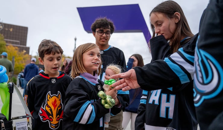 Olivia Lerwill shows her balloon wristband to family members Lucas Lerwill, Jason Lerwill and Katelyn Lerwill as the Utah Mammoth and Calgary Flames prepare to play at the Delta Center in Salt Lake City on Wednesday, Oct. 15, 2025. The family came from Alberta, Canada, for this game. | Scott G Winterton, Deseret News
