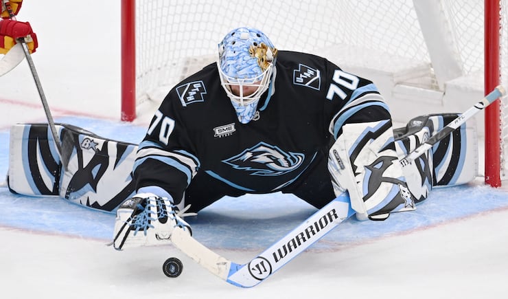 Utah Mammoth goaltender Karel Vejmelka (70) dives at the puck with his glove in the third period as the Utah Mammoth and Calgary Flames play at the Delta Center in Salt Lake City on Wednesday, Oct. 15, 2025. | Scott G Winterton, Deseret News