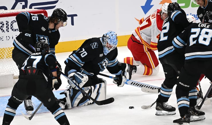 Utah Mammoth goaltender Karel Vejmelka (70) looks down at the puck as is slides past him in the third period as the Utah Mammoth and Calgary Flames play at the Delta Center in Salt Lake City on Wednesday, Oct. 15, 2025. | Scott G Winterton, Deseret News