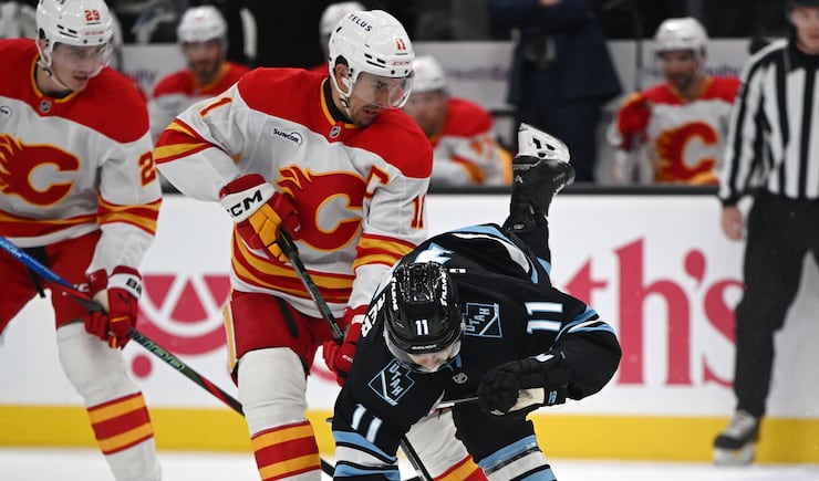 Calgary Flames center Mikael Backlund (11) knocks Utah Mammoth right wing Dylan Guenther (11) down as they battle during a game at the Delta Center in Salt Lake City on Wednesday, Oct. 15, 2025. | Scott G Winterton, Deseret News