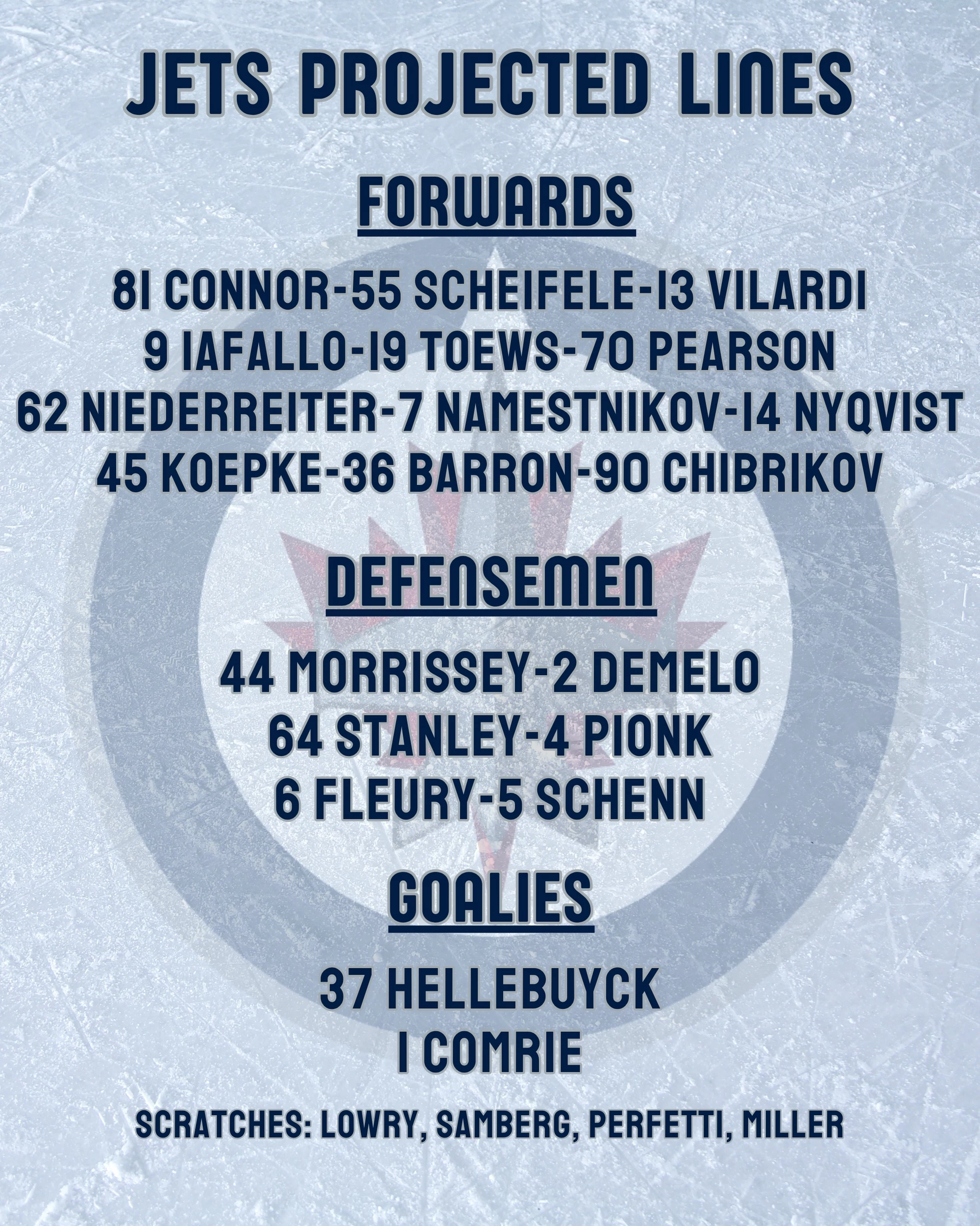 Connor Hellebuyck gets the start for the Jets. Hellebuyck bounced back from a season-opening loss with a win on Saturday, making 30 saves on 32 shots.