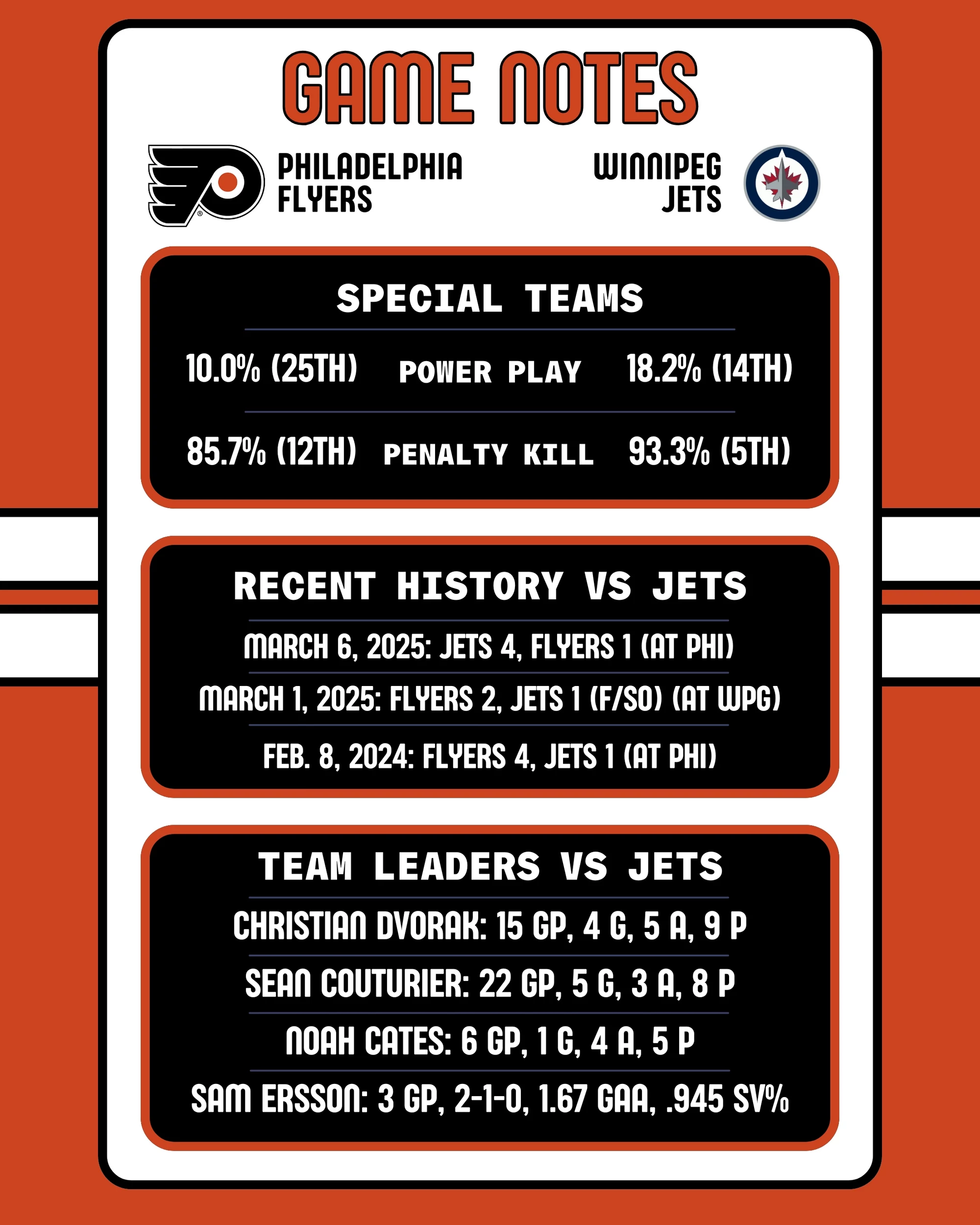 It doesn’t get any easier for the Flyers, as they welcome in another team that spent the 2024-25 season at the top of the standings. The reigning President’s Trophy winners, the Winnipeg Jets, are next up for the Flyers on Thursday night.