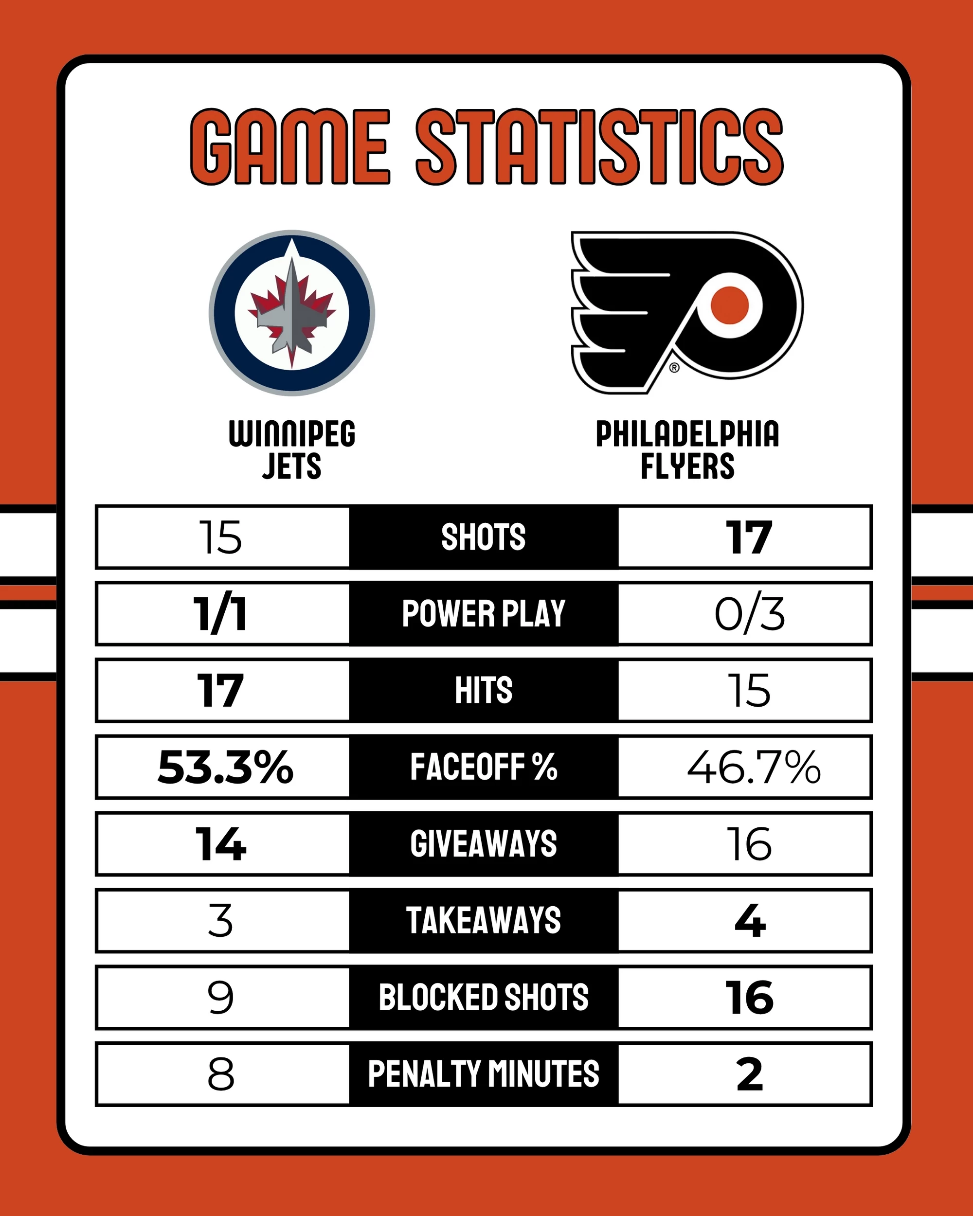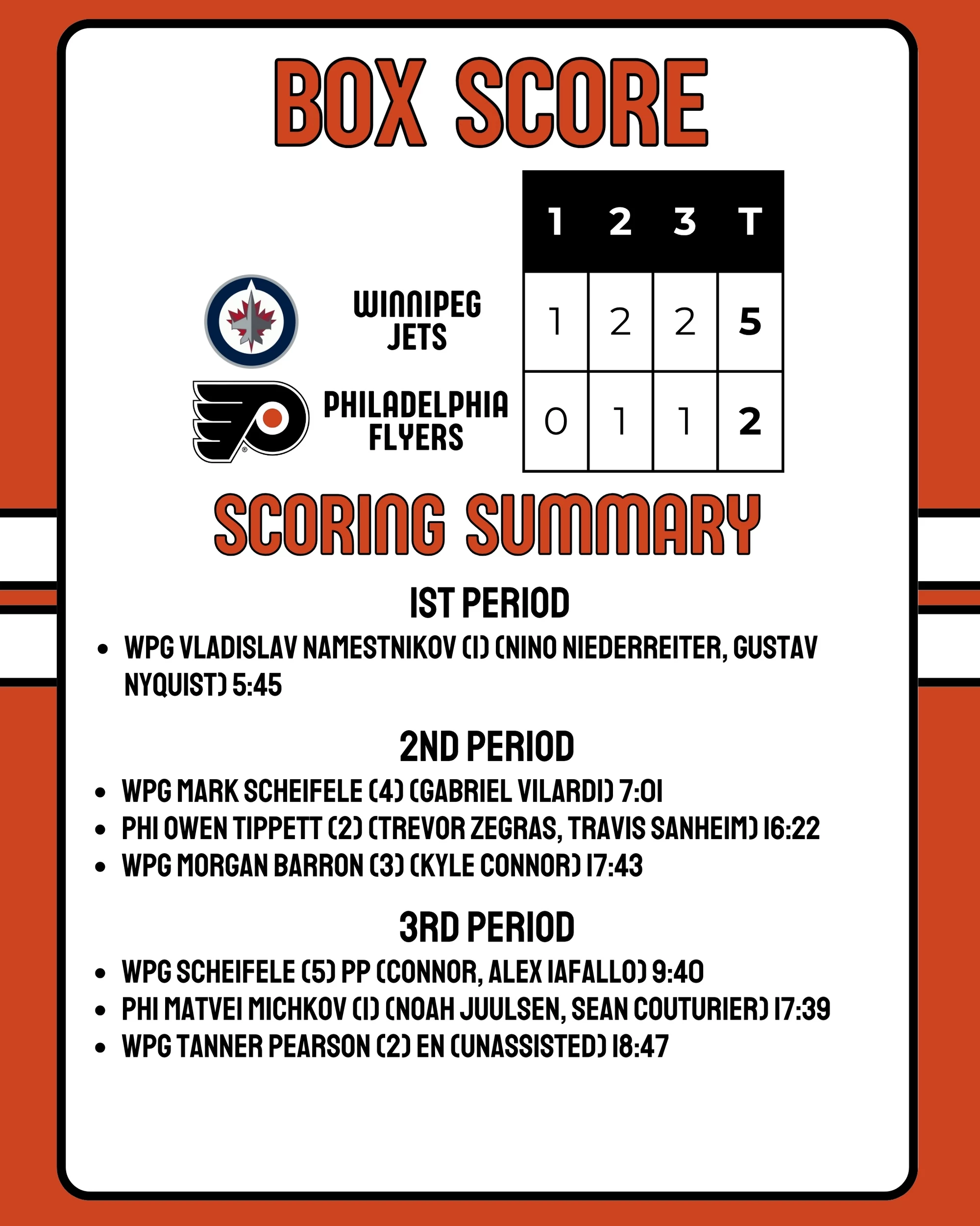 At 7:01 of the second, the Jets extended the lead. Mark Scheifele took a feed in the slot from Gabriel Vilardi, following another Flyers turnover, and buried it for his fourth goal of the season to make it 2-0.