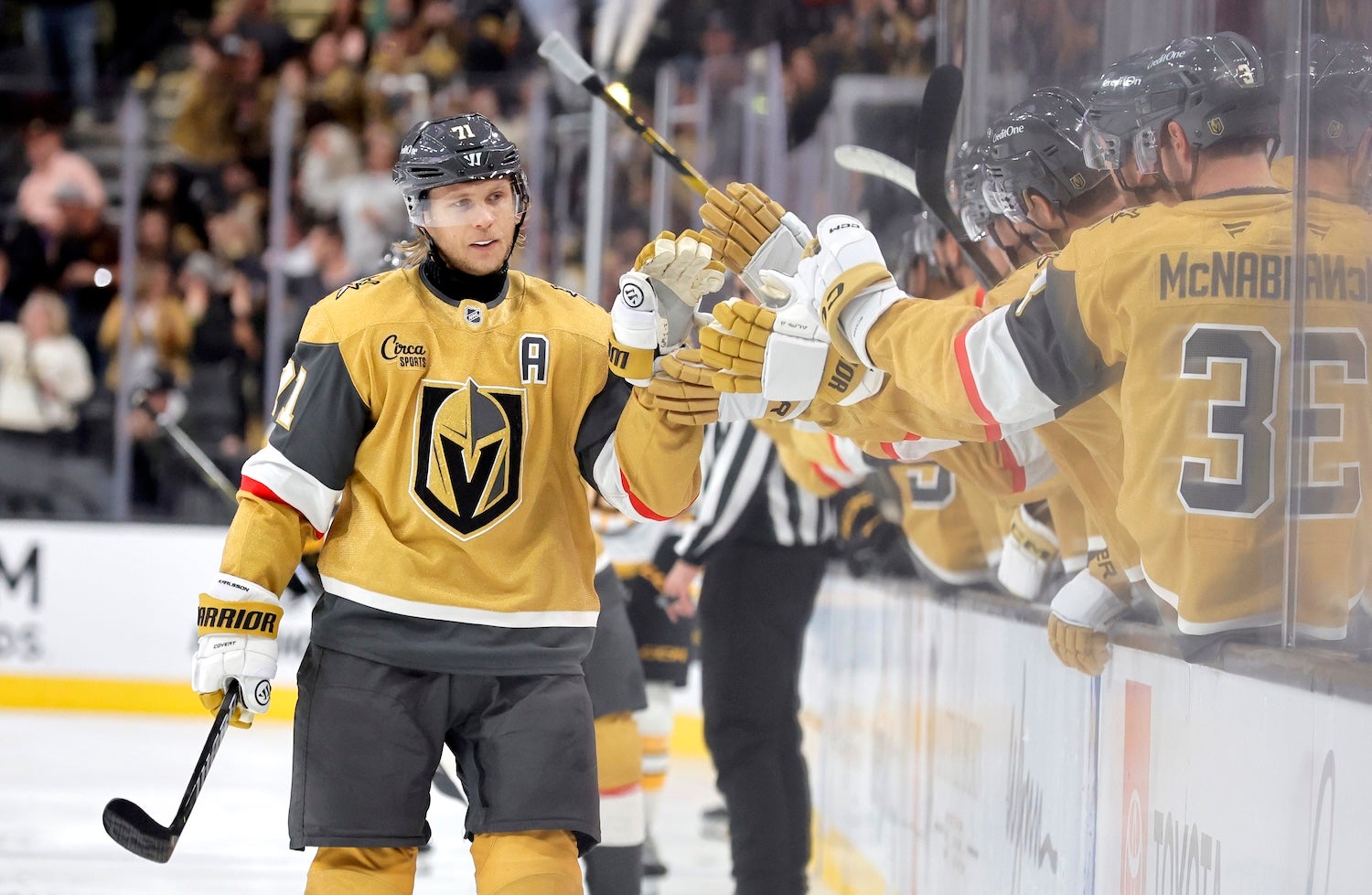 LAS VEGAS, NEVADA – OCTOBER 16: William Karlsson #71 of the Golden Knights is congratulated by teammates after scoring against Bruins at T-Mobile Arena. (Steve Marcus/Getty Images)