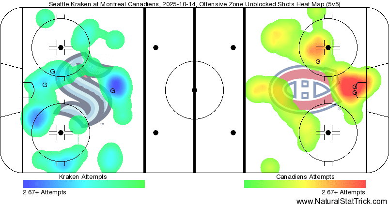 Even though you could point out Montreal held a large lead in quality chances at 5v5, there’s no such thing as ‘deserve’ in sports. The Kraken boldly took a 4-3 lead at the midway point of the third period when Jared McMann did a good job spinning off Arber Xhekaj before beating Montembeault with a solid shot.