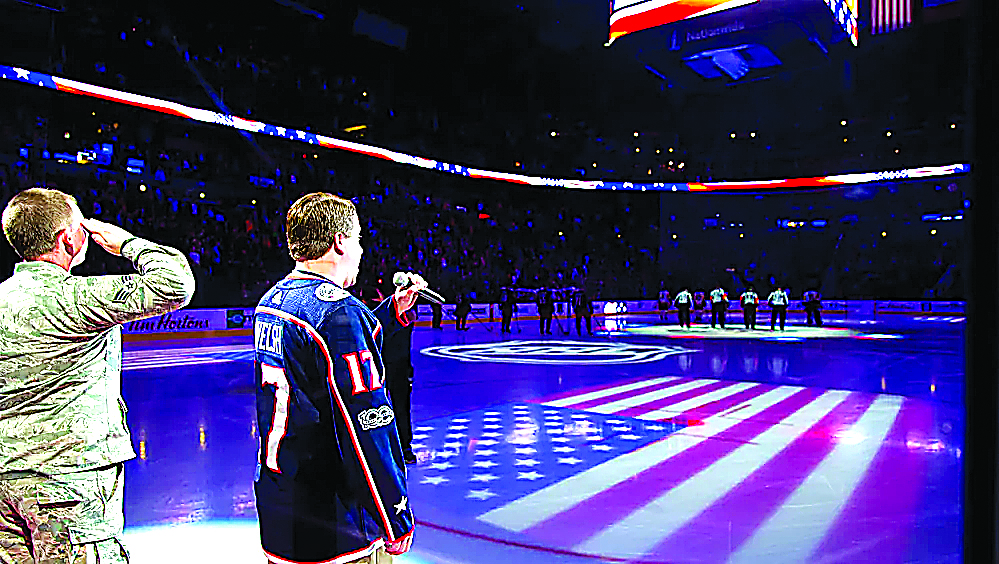 A military honoree joins St. Clairsville native Leo Welsh on ice has he sings the National Anthem at a Columbus Blue Jackets home game.