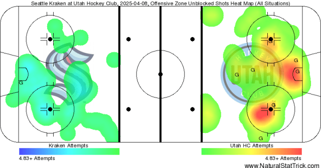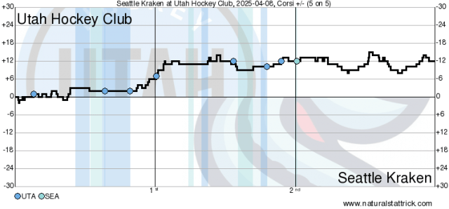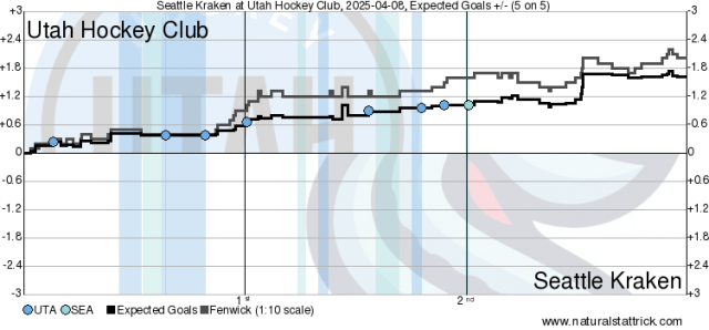 The Kraken played this game like they were skating in sand. The fatigue from playing such a tight game yesterday was both clear and apparent as they played one of their most penalty filled, defensively bereft games of their entire season; stiff competition given how this season has gone. The biggest killer was Utah’s power play, which happily made mincemeat of the Kraken’s mediocre efforts to try and kill them off, but with how frequently Seattle struggled to get much of anything going in the offensive end (the few times they ever went), it was clear there was nothing in the tank here to counterattack against a Utah squad that had nothing but attack to give. Just a rough night all around. The official line after the game was 3-for-6 for Utah, but they very easily could’ve had more. Just a disappointing day on special teams all around.