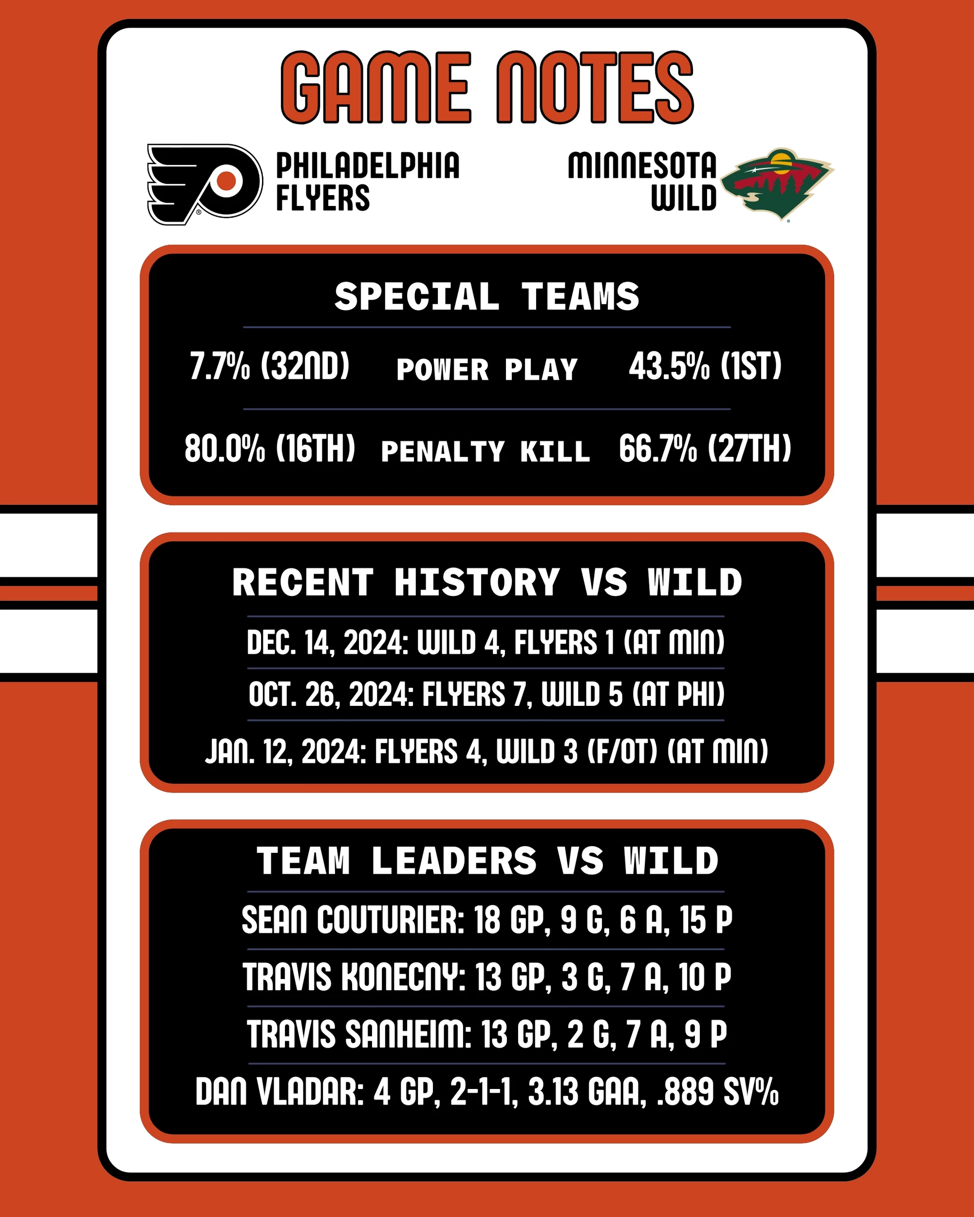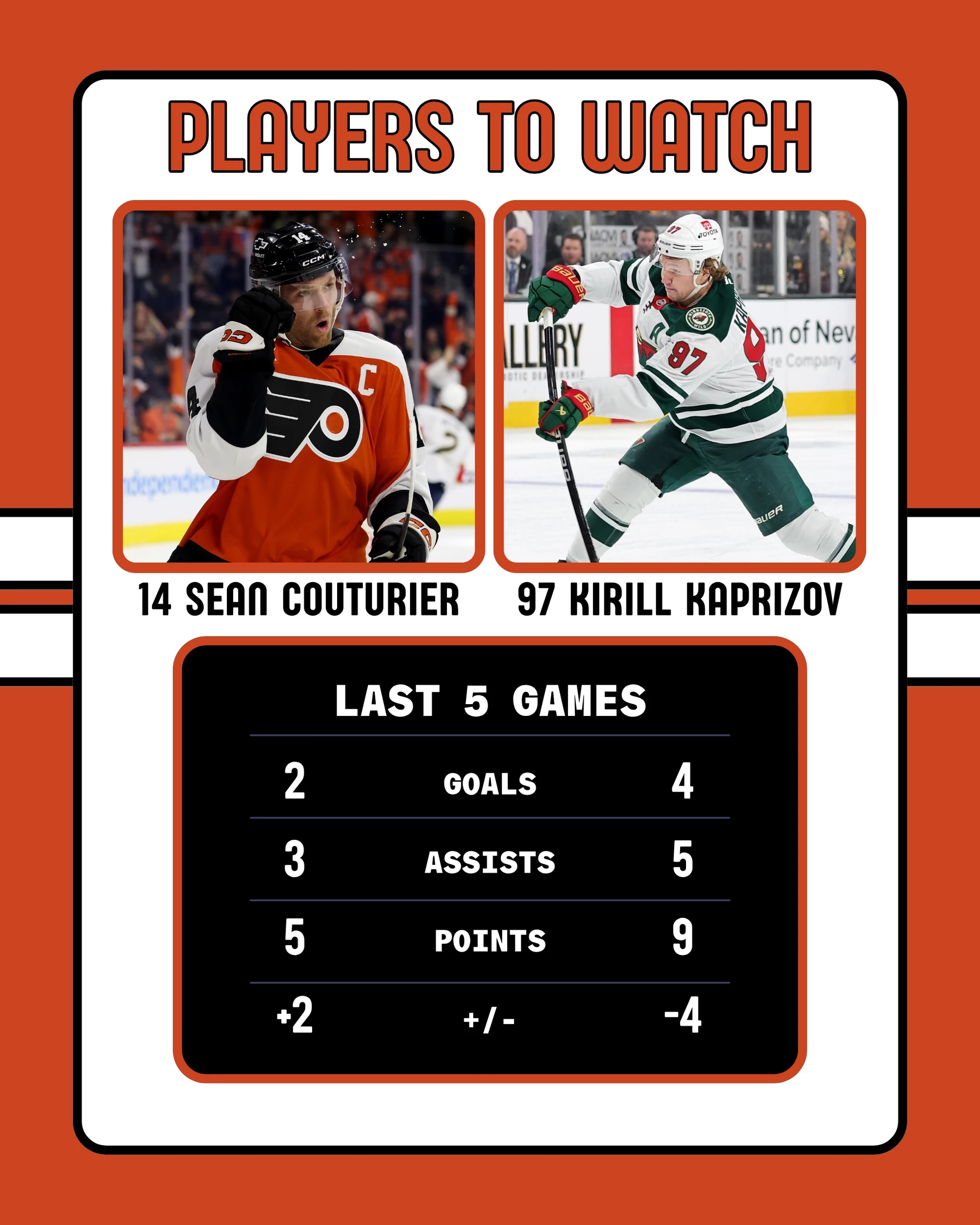 The Flyers are looking to get back on track after falling to Winnipeg on Thursday. Meanwhile, Minnesota is on the back end of a back-to-back after a lopsided loss to the Washington Capitals on Friday.