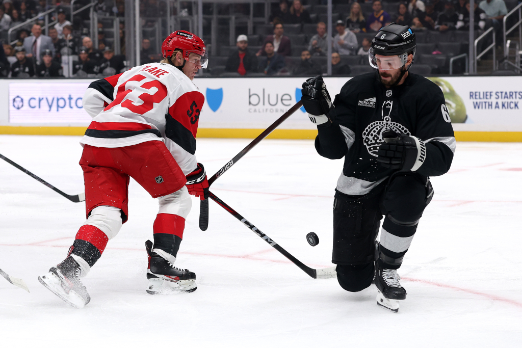 Jackson Blake #53 of the Carolina Hurricanes battles for control of the puck with Joel Edmundson #6 of the Los Angeles Kings during the first period at Crypto.com Arena on October 18, 2025 in Los Angeles, California. (Photo by Luke Hales/Getty Images)