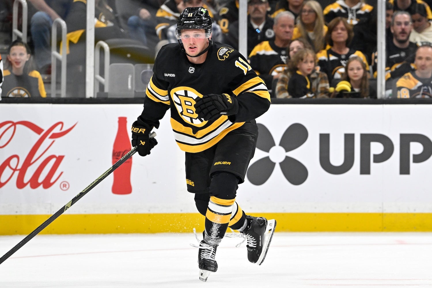 Sep 29, 2025; Boston, Massachusetts, USA; Boston Bruins center Casey Mittelstadt (11) watches the puck during the third period at TD Garden.(Eric Canha-Imagn Images)