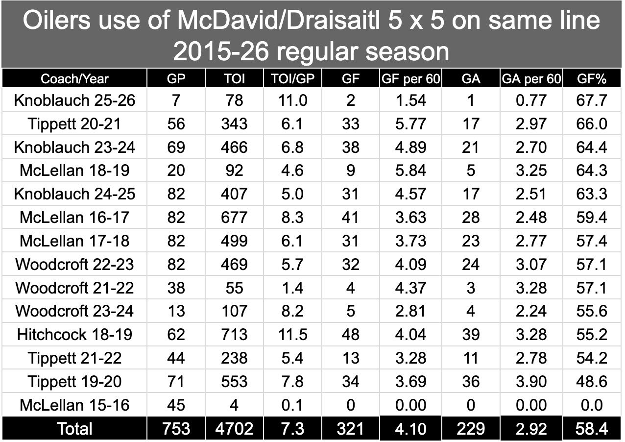6. While McDavid and Draisaitl have not been scoring, they’ve been playing solid enough defensive hockey. The opposition has scored just once when they’ve been on the ice together. I’m good with them together because I think McDavid is a solid defensive centre and that Draisaitl is a solid defensive winger. I think their best chance of winning the Cup is now with these two players on the same line.