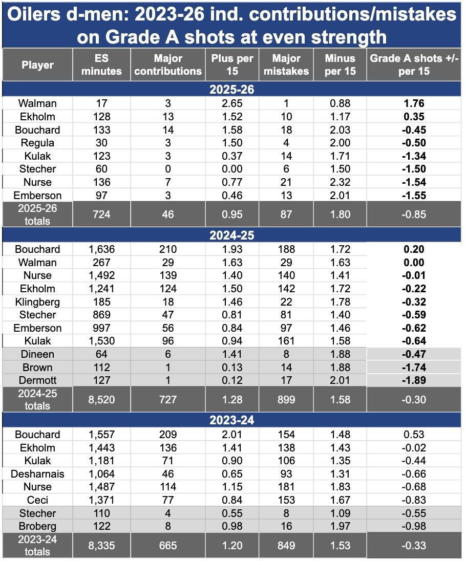 As a group at even strength so far this year, the d-men are making significantly fewer major contributions to Grade A shots and significantly more mistakes on Grade A shots against.
