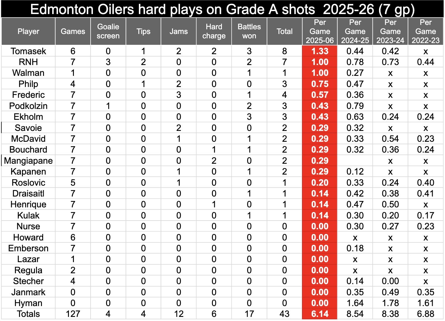 If you’re of an analytical bent you will note that the in the past two years the Oilers made, on average, 8+ hard plays on the net every game to create Grade A shots. These are hard charges, jam shots, tips, goalie screens and board battles won to create Grade A shots. This year they are down to 6.1 per game.