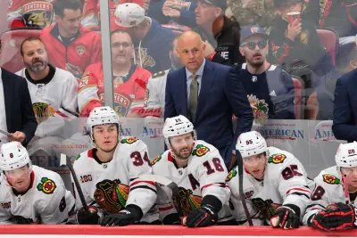 Oct 7, 2025; Sunrise, Florida, USA; Chicago Blackhawks head coach Jeff Blashill watches from the bench against the Florida Panthers during the third period at Amerant Bank Arena. Mandatory Credit: Sam Navarro-Imagn Images