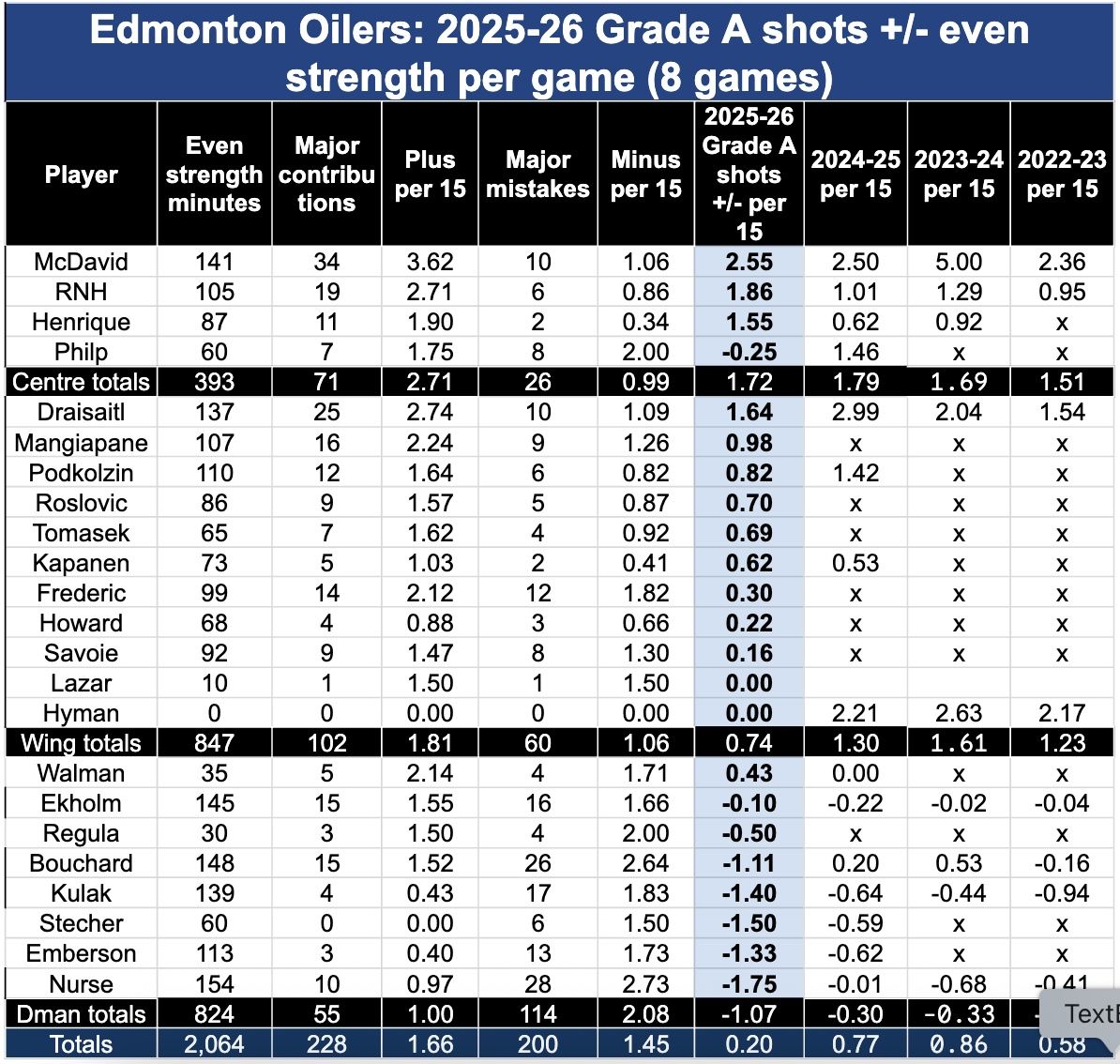 This current team has been awful when it comes to creating and defending Grade A shots. For example, as a group, Edmonton’s wingers were +1.3 Grade A shots per game in 2024-25, +1.61 in 2023-24 and +1.23 in 2022-23.