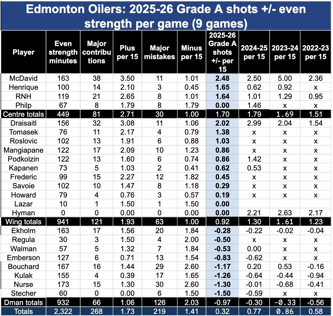 The Grade A shots were 17 for Edmonton, nine for Seattle, with the 5-alarm shots seven for the Oilers, two for the Krak (running count)