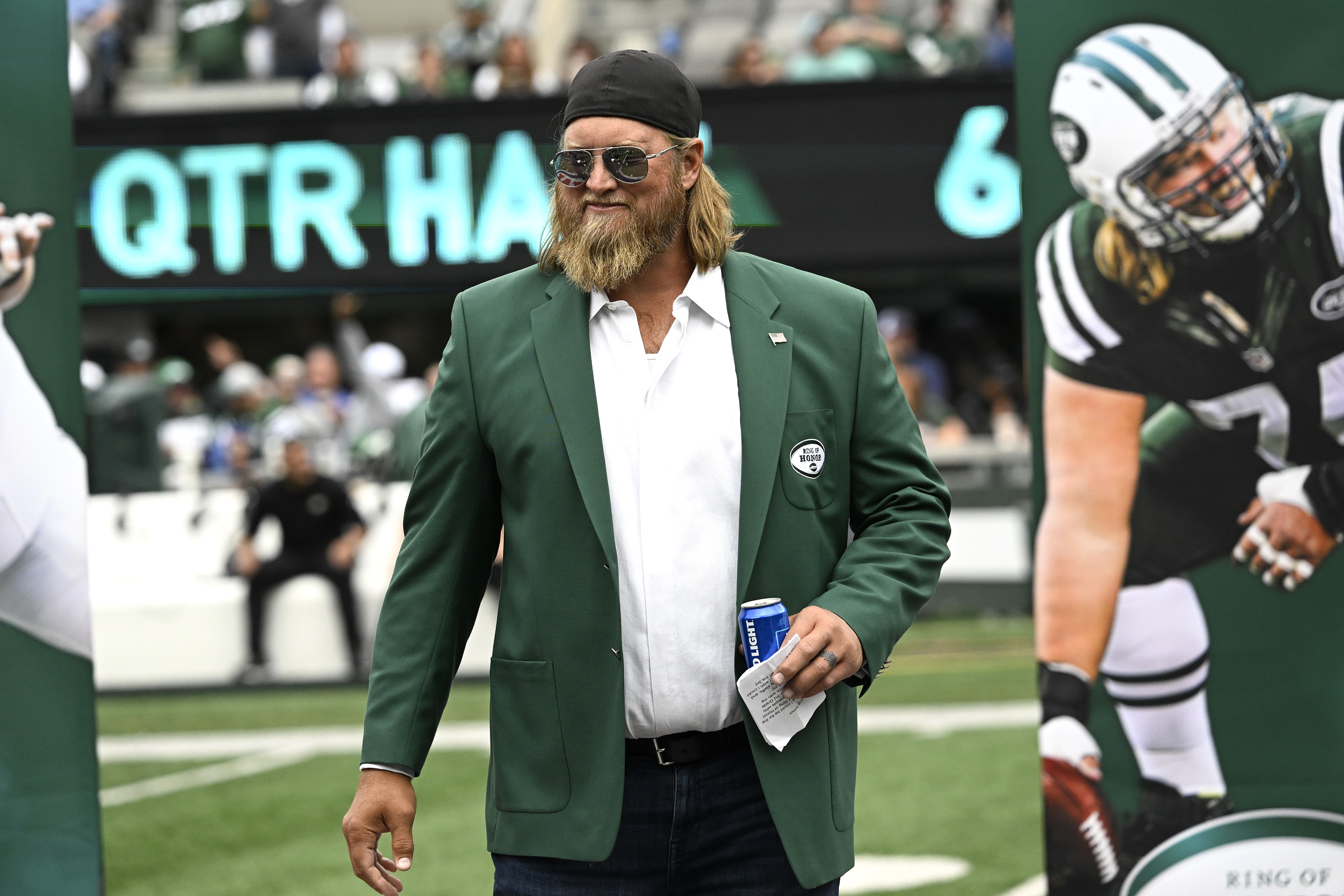 Former Jets center Nick Mangold salutes the fans with a beer at a ceremony inducting him into the Jets Ring of Honor. Bill Kostroun/New York Post