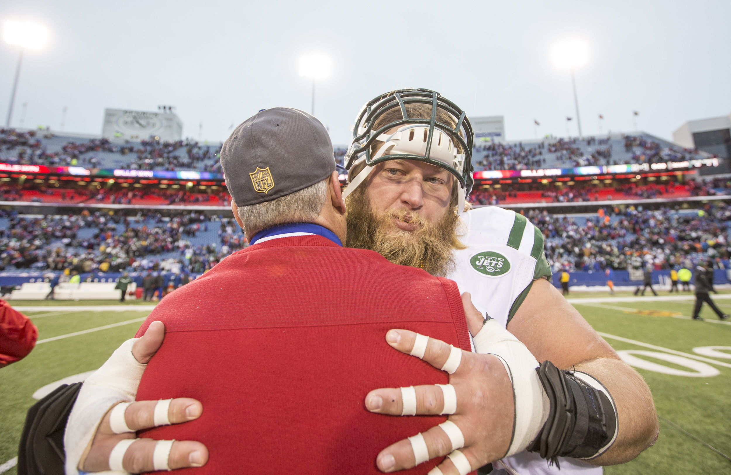 Bills head coach Rex Ryan hugs New York Jets Nick Mangold in 2016. Anthony J. Causi / @ACausi